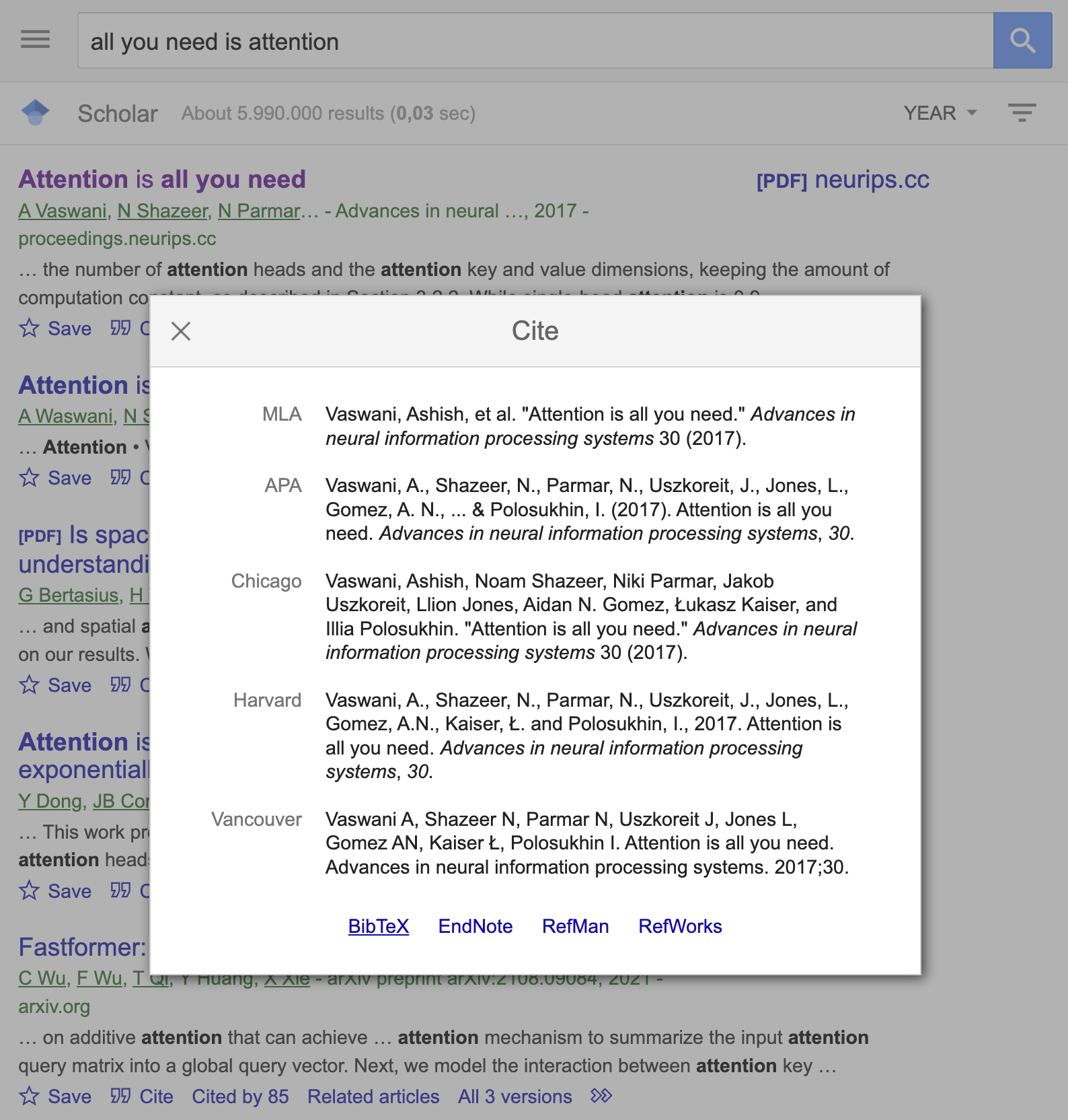 Here is a practical example. Letās say, you want to cite a famous paper about transformers. First, you find it in Google Scholar and click āCiteā: